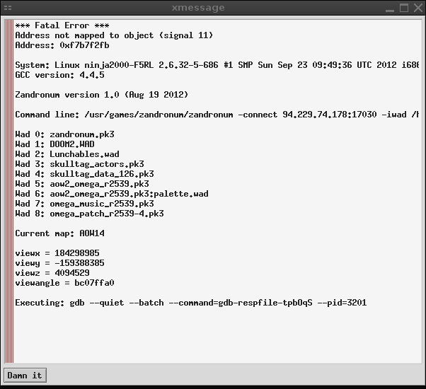 | Additional Information | Crash log output: *** Fatal Error *** Address not mapped to object (signal 11) Address: 0x1 System: Linux ninja2000-F5RL 2.6.32-5-686 #1 SMP Sun Sep 23 09:49:36 UTC 2012 i686 GNU/Linux GCC version: 4.4.5 Zandronum version 1.0 (Aug 19 2012) Command line: /usr/games/zandronum/zandronum /home/ninja2000/Desktop/brutaldoomv016b.pk3 Wad 0: zandronum.pk3 Wad 1: TNT.WAD Wad 2: Lunchables.wad Wad 3: skulltag_actors.pk3 Wad 4: skulltag_data_126.pk3 Wad 5: brutaldoomv016b.pk3 Wad 6: brutaldoomv016b.pk3:terrain.wad Current map: MAP27 viewx = 0 viewy = 0 viewz = 0 viewangle = 0 Executing: gdb --quiet --batch --command=gdb-respfile-geJFgN --pid=2607 | ||||||||