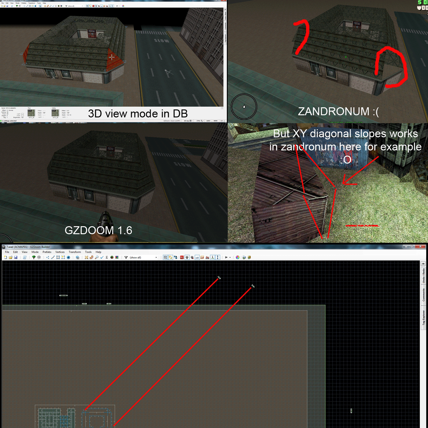 | Description | I attached a picture which describes this problem better. It's strange but Zandronum can render them actually(see screenshot), it depends on something..something I can't figure. Only happens with diagonal 3d slopes. It's obviosly a Zandronum bug, because GZDoom always able to render any 3D slopes. That's strange. Straight X or Y slopes always appear(In Zan I mean). | ||||||||
