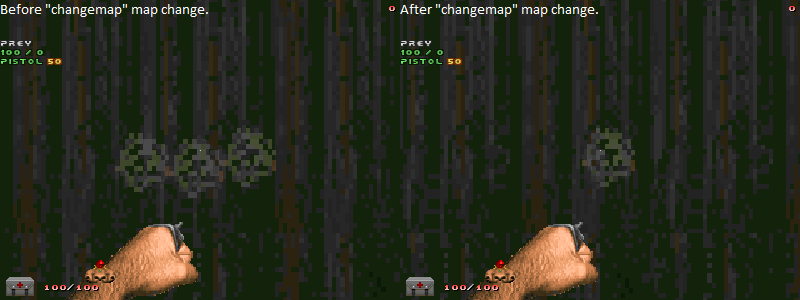| Steps To Reproduce | 1. zandronum -iwad doom2.wad -file changemap_rune.wad -host 2. "addbot" in the server console. This step is important to prevent telefragging when you're in the map locally. 3. zandronum -iwad doom2.wad -file changemap_rune.wad -connect localhost 4. Join the game. 5. Pick up the spread rune or "give spreadrune" in the console. 6. "changemap map01" in the server console. 7. Rapidly press +forward until you have moved away from the spawn spot to avoid being telefragged when in the map locally. | ||||||||||||