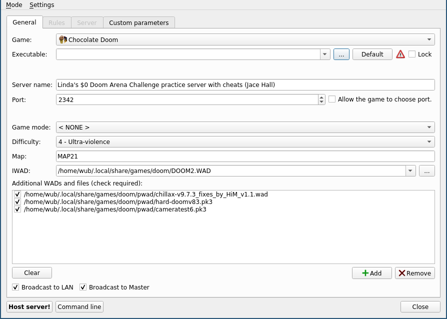 Everything looks good. I've also reviewed the code, and it was Zalewa's quality code. 10/10 IGN, approved. Wait. It looks like the plugin used in the remote mode is always the first one in the list, since the value in: CreateServerDialog::makeRemoteGameSetupDialog is ignored. This leads to chocolate-doom being selected, but if another plugin used this functionality it wouldn't work. |