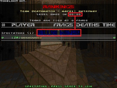 | Description | I'm just reporting this so it's not forgotten. For some reason, when timelimit runs out in teamDM without any players present, blue team is automatically given a win, whereas in other modes like CTF this results in a draw game or sudden death mode if enabled. It would probably be better if it was made consistent with the other modes and also resulted in a draw game instead of blue team winning. See the attached screenshot. |