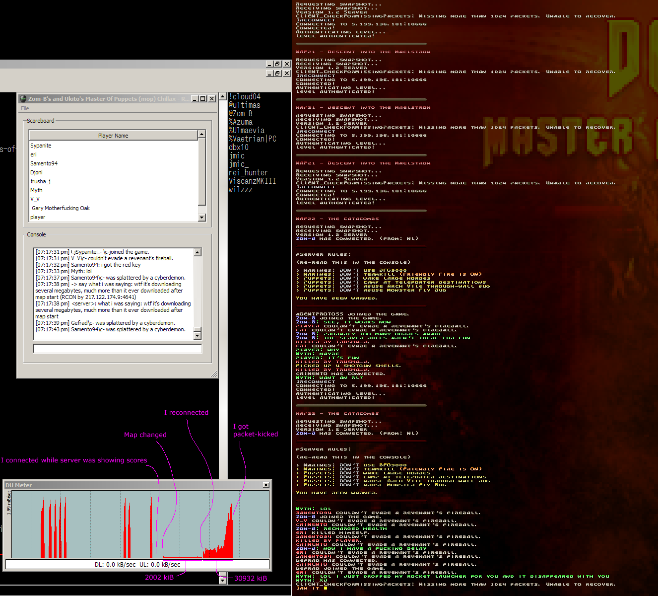 I added a screenshot and I have extra information that shows how ridiculous this is, and may help find the solution. When I connect to a server that fulfills above conditions, but at the exact moment the map is in transition (scoreboard is shown), it connects fine and uses approx 30 kiB/s. When I typed "reconnect" in the console after 1:20 min, it started downloading data at an unprecedented rate, and obviously pulls in way more than it would ever need (in only the first 9 seconds more than it downloaded in the 1:20 min before). Moreover, in the period before I got disconnected, there seemed to be a constant time delay. When I "say", or shoot at the wall, I see the reaction 5-10 seconds later. A few days ago I had the same, on the same map, but I got lucky. The time delay stayed constant for a minute or so and seemed to shorten in the minute after that. When the delay disappeared, the download speed went back to normal. This map is map22 from chillax.wad, if you check you'll see that with just 895 monsters this doesn't justify >30 MiB of data. >34 kiB per monster!? Even if there are 3x more balls in the air than there are monsters, this still doesn't calculate. Like someone said before, it ALSO happens when the server is localhost. (not the server in the screenshot) I think a cheap solution is to just let the clients download without checking for missing packets, and only start the game ticker when everything is received. This still doesn't fix the ridiculous amount that clients unnecessarily download. How can I edit the bug properties? I want to change Priority to Blocking and Version to 2.0Beta |
