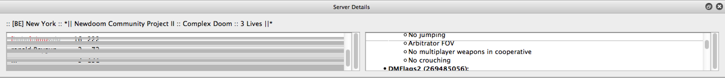| Steps To Reproduce | 1. Open Doomseeker. 2. Select any server from the list. The one that has many players is preferred. 3. Open Server Details category (⌘D). 4. Try to scroll. 5. Take a note that there are double scrollbars. | ||||||||