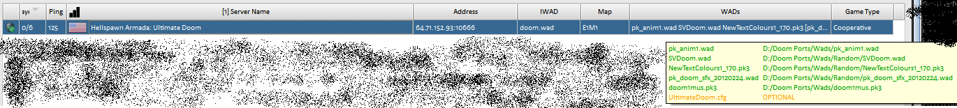 Forgot to add.. the sh file uploaded on this ticket is for testing. Adjust the paths in it before running it. Mind you, this is on Linux. EDIT: Come to figure out, if you move the cfg bit in the sh file before the -optfile, it will not show it as an optional wad. It also shows in Doomseeker. Doomseeker screenshot posted |