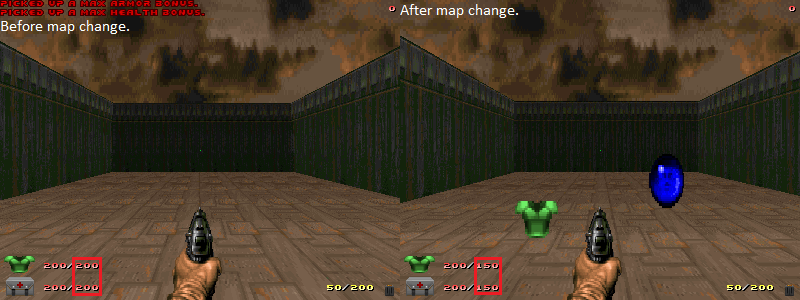 | Steps To Reproduce | Create Wad/PK3 with the code below and use it to get more than 150 max armor or health. When changing the map or moving to the next map on coop it resets to 150 unless you are below 150. | ||||||||