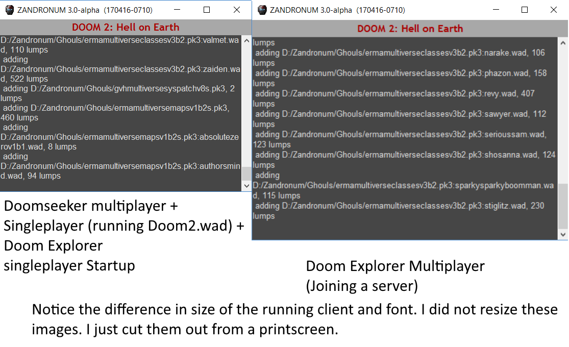 I've joined my own TSPG server and logged the console in these pastebins: 'https://pastebin.com/QEVWzBuQ [^]' 'https://pastebin.com/JDrk1mz8 [^]' I'm not exactly noticing any difference aside from this " adding C:/Users/Kuvira/AppData/Roaming/Doom Explorer/ZandronumTesting/zandronum.pk3, 689 lumps" If I remove or replace the files in this directory, the Doom Explorer tells me "this server requires a special version of Zandronum...", even though the directory is still exactly the same (as in, leading to the same "Zandronum.exe" file"). For now, I cannot run Zandronum 3.0 anymore without those files in that directory. Both program directories (for Doom Explorer and DoomSeeker) lead to: D/Zandronum/Zandronum.exe. They still run as if they're different programs, along with different settings in resolution, sound and controls. Weird thing is; there's only one .ini file for Zandronum, meaning the settings shouldn't change at all. I will also provide a picture that clearly shows a difference in size/font when starting Zandro 3.0 in different ways. I'll just run with Doomseeker and get used to that. At least that works :) |