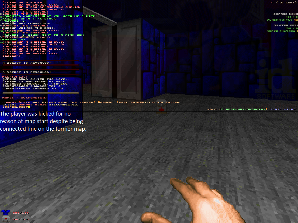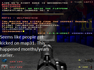 I've observed people getting kicked from MAP31 in vanilla Doom 2 several times now despite them being connected and playing fine on the former map, usually MAP15. One time happened very recently, while the other time happened years earlier. I've got some screenshots taken from when both incidents happened. |