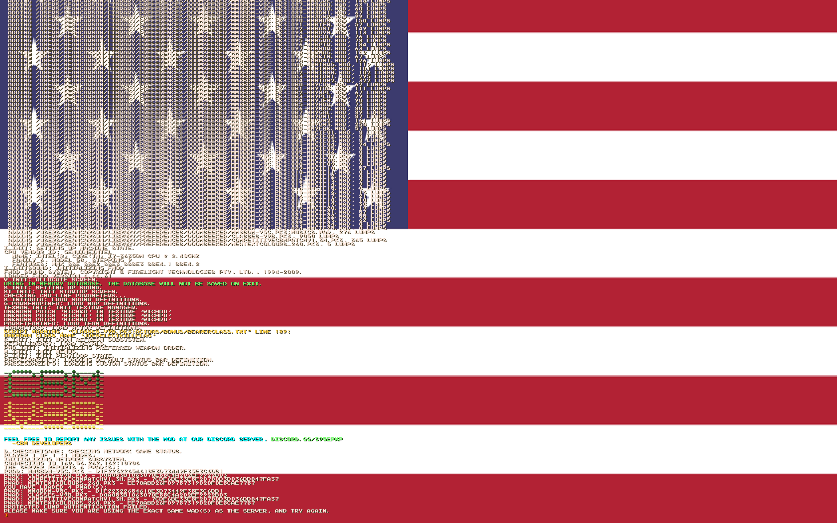 I'm sorry I havent responded in so long. Life has been busy lately. That server isnt up anymore, but I'm having the same issue with one hosting justifiedclasses-v4b-beta14h.pk3. log: Babou:~ seancarson$ /Applications/Zandronum.app/Contents/MacOS/zandronum -connect 173.68.64.90:10666 -iwad /Users/seancarson/Library/Preferences/Doomseeker/megagame.wad -file /Users/seancarson/Library/Preferences/Doomseeker/mm8bdm-v5c.pk3 -file /Users/seancarson/Library/Preferences/Doomseeker/justifiedclasses-v4b-beta14h.pk3 +cl_hidecountry 0 logfile zandronumlumps.txt Zandronum 3.0 - 170901-1140 - SDL version Compiled on Sep 1 2017 Using video driver Quartz M_LoadDefaults: Load system defaults. W_Init: Init WADfiles. adding /Applications/Zandronum.app/Contents/MacOS/zandronum.pk3, 689 lumps adding /Users/seancarson/Library/Preferences/Doomseeker/megagame.wad, 607 lumps adding /Users/seancarson/Library/Preferences/Doomseeker/mm8bdm-v5c.pk3, 12326 lumps adding /Users/seancarson/Library/Preferences/Doomseeker/mm8bdm-v5c.pk3:000-titlemap.wad, 33 lumps adding /Users/seancarson/Library/Preferences/Doomseeker/mm8bdm-v5c.pk3:001-teamfix.wad, 8 lumps adding /Users/seancarson/Library/Preferences/Doomseeker/mm8bdm-v5c.pk3:001-unknown.wad, 40 lumps adding /Users/seancarson/Library/Preferences/Doomseeker/mm8bdm-v5c.pk3:001-unknown2.wad, 190 lumps adding /Users/seancarson/Library/Preferences/Doomseeker/mm8bdm-v5c.pk3:001-unknown3.wad, 8 lumps adding /Users/seancarson/Library/Preferences/Doomseeker/mm8bdm-v5c.pk3:001-unknown4.wad, 8 lumps adding /Users/seancarson/Library/Preferences/Doomseeker/mm8bdm-v5c.pk3:001-unknown5.wad, 23 lumps adding /Users/seancarson/Library/Preferences/Doomseeker/mm8bdm-v5c.pk3:002-lightlab.wad, 168 lumps adding /Users/seancarson/Library/Preferences/Doomseeker/mm8bdm-v5c.pk3:002-training.wad, 31 lumps adding /Users/seancarson/Library/Preferences/Doomseeker/mm8bdm-v5c.pk3:003-1-6credits.wad, 8 lumps adding /Users/seancarson/Library/Preferences/Doomseeker/mm8bdm-v5c.pk3:004-7credits.wad, 17 lumps adding /Users/seancarson/Library/Preferences/Doomseeker/mm8bdm-v5c.pk3:005-8credits.wad, 17 lumps adding /Users/seancarson/Library/Preferences/Doomseeker/mm8bdm-v5c.pk3:006-wtcredits.wad, 25 lumps adding /Users/seancarson/Library/Preferences/Doomseeker/mm8bdm-v5c.pk3:007-9credits.wad, 20 lumps adding /Users/seancarson/Library/Preferences/Doomseeker/mm8bdm-v5c.pk3:010-mm1cut.wad, 27 lumps adding /Users/seancarson/Library/Preferences/Doomseeker/mm8bdm-v5c.pk3:011-mm1gut.wad, 37 lumps adding /Users/seancarson/Library/Preferences/Doomseeker/mm8bdm-v5c.pk3:012-mm1bom.wad, 40 lumps adding /Users/seancarson/Library/Preferences/Doomseeker/mm8bdm-v5c.pk3:013-mm1ele.wad, 35 lumps adding /Users/seancarson/Library/Preferences/Doomseeker/mm8bdm-v5c.pk3:014-mm1ice.wad, 39 lumps adding /Users/seancarson/Library/Preferences/Doomseeker/mm8bdm-v5c.pk3:015-mm1fir.wad, 39 lumps adding /Users/seancarson/Library/Preferences/Doomseeker/mm8bdm-v5c.pk3:016-mm1tim.wad, 64 lumps adding /Users/seancarson/Library/Preferences/Doomseeker/mm8bdm-v5c.pk3:017-mm1oil.wad, 76 lumps adding /Users/seancarson/Library/Preferences/Doomseeker/mm8bdm-v5c.pk3:018-mm1dw1.wad, 42 lumps adding /Users/seancarson/Library/Preferences/Doomseeker/mm8bdm-v5c.pk3:019-mm1dw2.wad, 37 lumps adding /Users/seancarson/Library/Preferences/Doomseeker/mm8bdm-v5c.pk3:020-mm2bub.wad, 36 lumps adding /Users/seancarson/Library/Preferences/Doomseeker/mm8bdm-v5c.pk3:021-mm2air.wad, 20 lumps adding /Users/seancarson/Library/Preferences/Doomseeker/mm8bdm-v5c.pk3:022-mm2hea.wad, 37 lumps adding /Users/seancarson/Library/Preferences/Doomseeker/mm8bdm-v5c.pk3:023-mm2fla.wad, 33 lumps adding /Users/seancarson/Library/Preferences/Doomseeker/mm8bdm-v5c.pk3:024-mm2qui.wad, 20 lumps adding /Users/seancarson/Library/Preferences/Doomseeker/mm8bdm-v5c.pk3:025-mm2woo.wad, 53 lumps adding /Users/seancarson/Library/Preferences/Doomseeker/mm8bdm-v5c.pk3:026-mm2cra.wad, 47 lumps adding /Users/seancarson/Library/Preferences/Doomseeker/mm8bdm-v5c.pk3:027-mm2met.wad, 46 lumps adding /Users/seancarson/Library/Preferences/Doomseeker/mm8bdm-v5c.pk3:028-mm2dw1.wad, 34 lumps adding /Users/seancarson/Library/Preferences/Doomseeker/mm8bdm-v5c.pk3:029-mm2dw2.wad, 70 lumps adding /Users/seancarson/Library/Preferences/Doomseeker/mm8bdm-v5c.pk3:02a-mm2dw3.wad, 17 lumps adding /Users/seancarson/Library/Preferences/Doomseeker/mm8bdm-v5c.pk3:030-mm3sna.wad, 45 lumps adding /Users/seancarson/Library/Preferences/Doomseeker/mm8bdm-v5c.pk3:031-mm3top.wad, 60 lumps adding /Users/seancarson/Library/Preferences/Doomseeker/mm8bdm-v5c.pk3:032-mm3nee.wad, 62 lumps adding /Users/seancarson/Library/Preferences/Doomseeker/mm8bdm-v5c.pk3:033-mm3har.wad, 33 lumps adding /Users/seancarson/Library/Preferences/Doomseeker/mm8bdm-v5c.pk3:034-mm3gem.wad, 41 lumps adding /Users/seancarson/Library/Preferences/Doomseeker/mm8bdm-v5c.pk3:035-mm3mag.wad, 42 lumps adding /Users/seancarson/Library/Preferences/Doomseeker/mm8bdm-v5c.pk3:036-mm3spa.wad, 53 lumps adding /Users/seancarson/Library/Preferences/Doomseeker/mm8bdm-v5c.pk3:037-mm3sha.wad, 52 lumps adding /Users/seancarson/Library/Preferences/Doomseeker/mm8bdm-v5c.pk3:038-mm3dw1.wad, 45 lumps adding /Users/seancarson/Library/Preferences/Doomseeker/mm8bdm-v5c.pk3:040-mm4pha.wad, 42 lumps adding /Users/seancarson/Library/Preferences/Doomseeker/mm8bdm-v5c.pk3:041-mm4div.wad, 106 lumps adding /Users/seancarson/Library/Preferences/Doomseeker/mm8bdm-v5c.pk3:042-mm4dri.wad, 41 lumps adding /Users/seancarson/Library/Preferences/Doomseeker/mm8bdm-v5c.pk3:043-mm4toa.wad, 52 lumps adding /Users/seancarson/Library/Preferences/Doomseeker/mm8bdm-v5c.pk3:044-mm4dus.wad, 46 lumps adding /Users/seancarson/Library/Preferences/Doomseeker/mm8bdm-v5c.pk3:045-mm4rin.wad, 25 lumps adding /Users/seancarson/Library/Preferences/Doomseeker/mm8bdm-v5c.pk3:046-mm4sku.wad, 29 lumps adding /Users/seancarson/Library/Preferences/Doomseeker/mm8bdm-v5c.pk3:047-mm4bri.wad, 48 lumps adding /Users/seancarson/Library/P