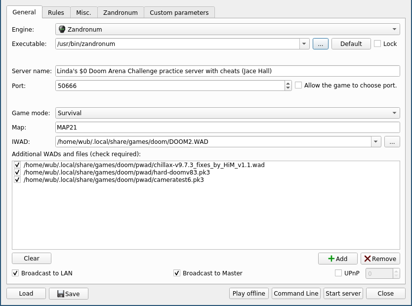 Everything looks good. I've also reviewed the code, and it was Zalewa's quality code. 10/10 IGN, approved. Wait. It looks like the plugin used in the remote mode is always the first one in the list, since the value in: CreateServerDialog::makeRemoteGameSetupDialog is ignored. This leads to chocolate-doom being selected, but if another plugin used this functionality it wouldn't work. |