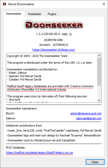 Beta package for Windows available at the beta auto-update channel and at:'https://devbuilds.drdteam.org/doomseeker/doomseeker-1.3.3~beta-230105-1140_windows.zip [^]' Please test if the copyright blurb for Mailfud appears in the about dialog and that there's an URL pointing to the mailfud.org website. |