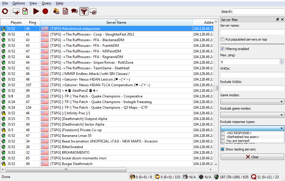 Quote from "Bill Buchanan" When a server doesn't respond it's most likely a problem with the server and such server will never respond. Doomseeker tries hard to ensure that no connectivity issues will make servers appear as <NO RESPONSE>. So, when it can't reach the server, it probably means that no one else can't reach that server either. Such servers are probably behind firewalls or NATs and the people who host these servers either aren't aware of that or don't care. Quote from "Bill Buchanan" Thank you. Quote from "Bill Buchanan" So you're saying you wish to have the "banned" servers hidden because it will make it easier for you to refresh the "too soon" servers? Is that it? Because if so then maybe the better solution for you here isn't to filter out the "banned" servers but to help you deal with the "too soon" ones. The one thing here is that Doomseeker doesn't spend so much effort with the "too soon" servers as it does with the "<NO RESPONSE>" ones. It simply gives up and leaves them up to the user. But maybe Doomseeker could auto-refresh those servers with some extra delay? Instead of telling the user to "wait a while and try again" it would instead say "retrying in a few seconds ..." and then do that on its own? Of course, the problem with the filtering of the "banned" servers still holds but I'm not sure yet if we should add another filter for them, plainly treat them as invalid or add an option to the "Appearance" config box that will allow the user to treat the "banned" servers as "invalid". I'm not considering adding an advanced filtering method as viable for now. |