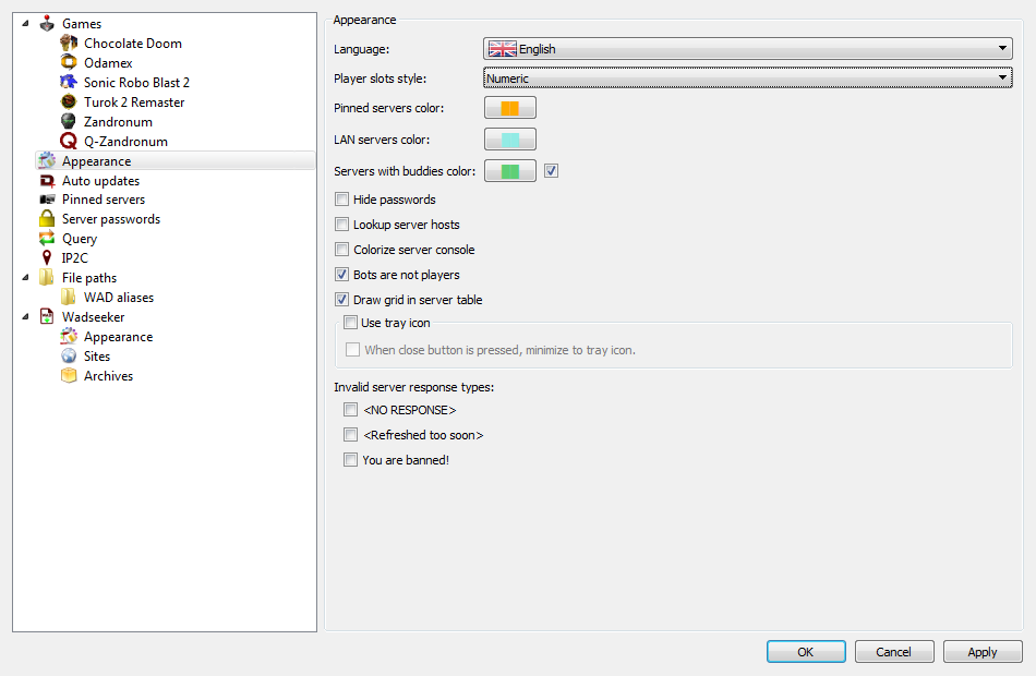 Quote Once in a great while (and I do mean rarely), a <NO RESPONSE> server will pop back up after refreshing it with my above procedure (start Doomseeker or hit refresh all, then select all the irregular response servers sorted at the bottom). However, this is very infrequent and rare, much more than recovering <too soon> servers. Quote At least for the Appearance config box, mockup 004 (first post attachment) is a demonstration of what that might look like. I would be intrigued if there's a way to address the amount of <Refreshed too soon> that happen. Though I should note that I haven't and don't touch the query response time and frequency options, since I trust the default options and don't want to do something silly that would start breaking things. I also don't want to hijack a different issue here with a tangent (unless with permission of course). That's really the bottom line of where I am now. I'd like to remove Banned servers but keep other invalid response types, in a way that's satisfactory without adding a bunch of UI options. |