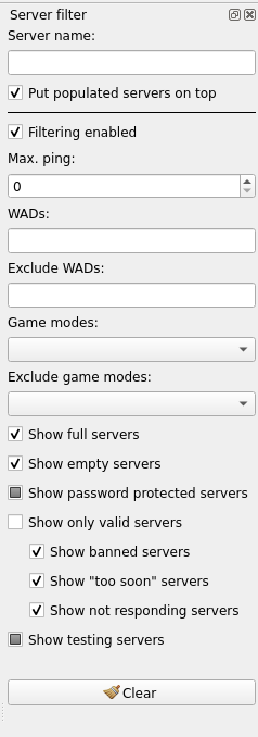 Pre-text: Issue 0004072 taught me the "Clear" button in another window such buttons labeled "Clear" with such icon may not do anything. lol (To clarify: In "Create Game", pressing a "Clear" button does not clear textboxes in that window. Here in server filters panel, pressing "Clear" clears the filter textboxes.) |