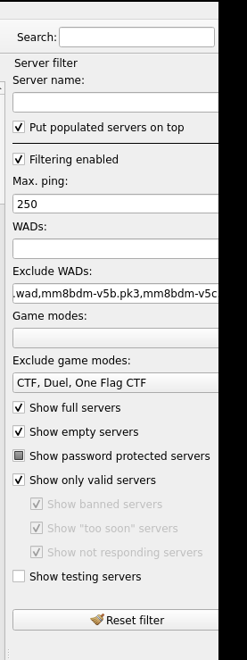 0004078:0022604:Quote from Zalewa An issue illustrated with an attached picture occurred briefly where the right side of the button cut-off, when testing with configuration from a previous version of Doomseeker. I tried adjusting the server filter panel width, initially made it worse by hiding the right side dropdown menu arrows and "X". I fixed this glitch by switching between tiling and floating window mode and dragging the server filter panel width a few more times. |