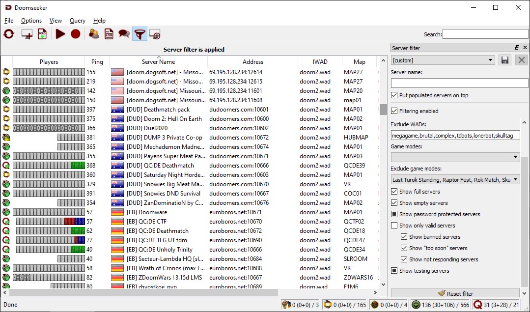Can't confirm, see the doomseeker-4121-noconfirm.jpg attachment. Something else must be affecting your server list.\ 1. Did you try resetting the filter first with the button at the bottom of the filter panel? 2. Are Q-Zandronum and Odamex enabled in the Query menu? |