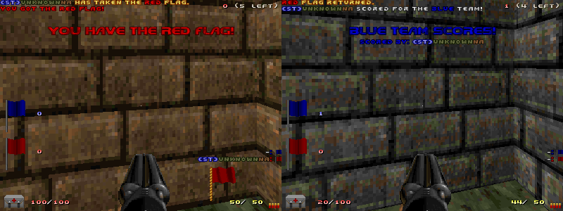 * Skulltag mode is also affected by the same issue. * None of the messages appear at all in OneFlagCTF, not even online. |