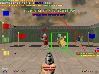 | Description | Among the other inconsistent message colors in the CTF mode, the name colors on the HUD seem to be wrong, they show the color of the flag team instead of the color of the flag holder. This makes it rather confusing to see who is actually holding the flags when playing with 3- and 4-way CTF. If you look at the attached screenshot, the green flag is being taken by Strife Guy and the subtext of the main flag message is printed in blue and is correct, yet the "held by" HUD name displays the color of the flag team instead of the color of Strife Guy's blue team. You can also see that Linguica on the green team is holding the gold flag, yet his name is displayed in gold. | ||||||||