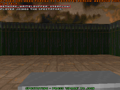 | Steps To Reproduce | 1. zandronum -iwad doom2.wad -file kickfromgame_errormsg_01.wad +map map01 2. Press the switch to get kicked from the game. The error message appears. | ||||||||||||